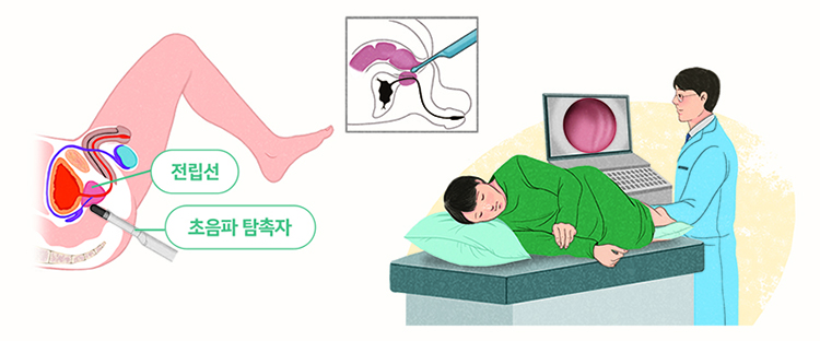 전립선 필수검사 중 하나로 전립선의 크기, 모양, 결석, 종양여부 등을 직접 관찰할 수 있어 유용한 검사입니다. 항문을 통해 짧은 초음파가 들어가는 경직장 검사법이 표준적인 접근방식이며 전립선 초음파 검사법 중 가장 정확한 결과를 보여주기 때문에 비뇨의학과에서 주로 시행하고 있습니다. 전립선 조직검사도 이러한 경직장 검사법을 통해 주로 시행하고 있습니다. 일부에서 검사장비가 준비되지 않거나 경험이 적은 경우 복부 초음파를 통해 검사하기도 하나 정확성이 다소 낮은 단점이 있습니다.